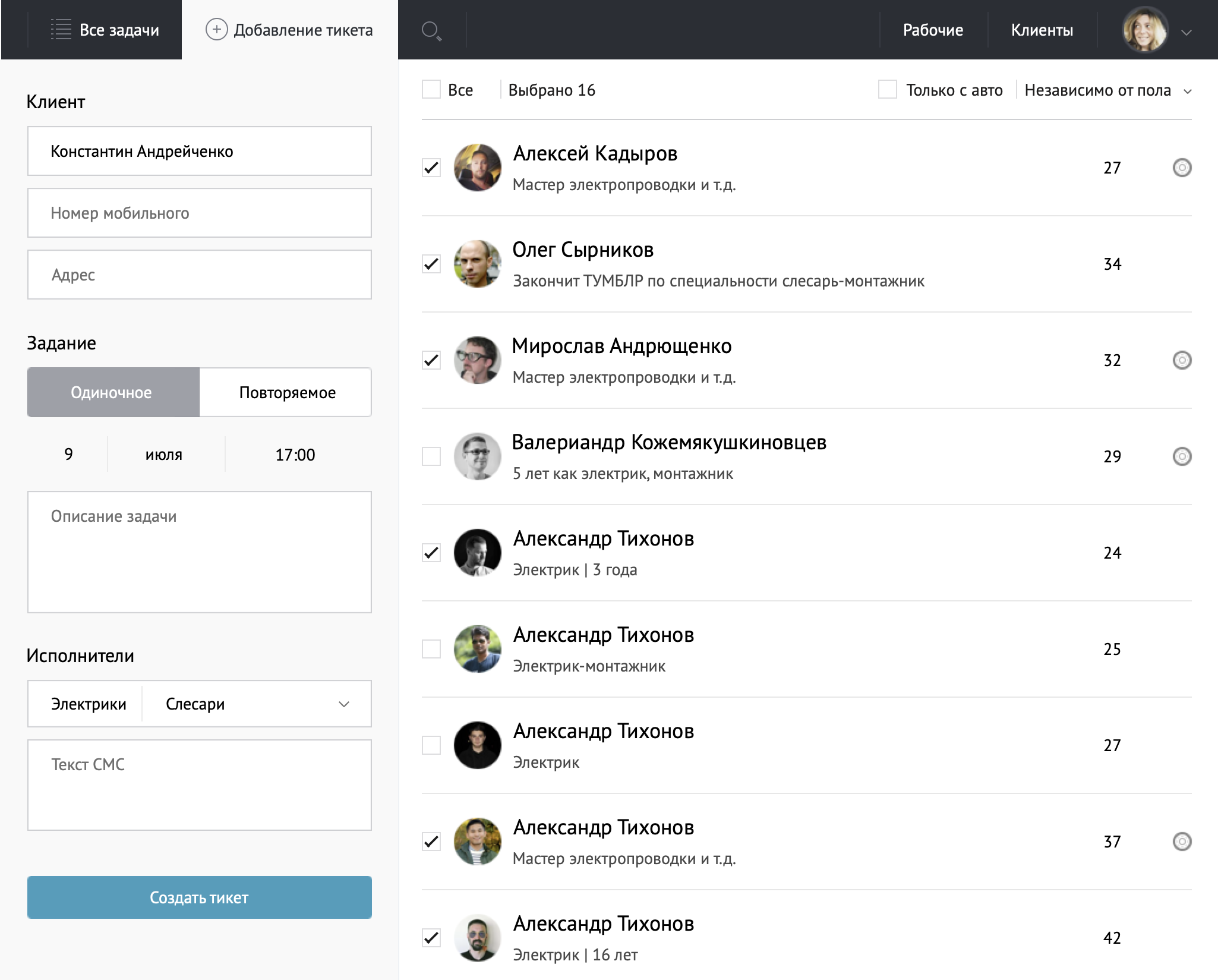 Сторінка з додаванням нового тікету та людей, яким будуть надіслані СМС (так, на той момент працювало ще таким чином)