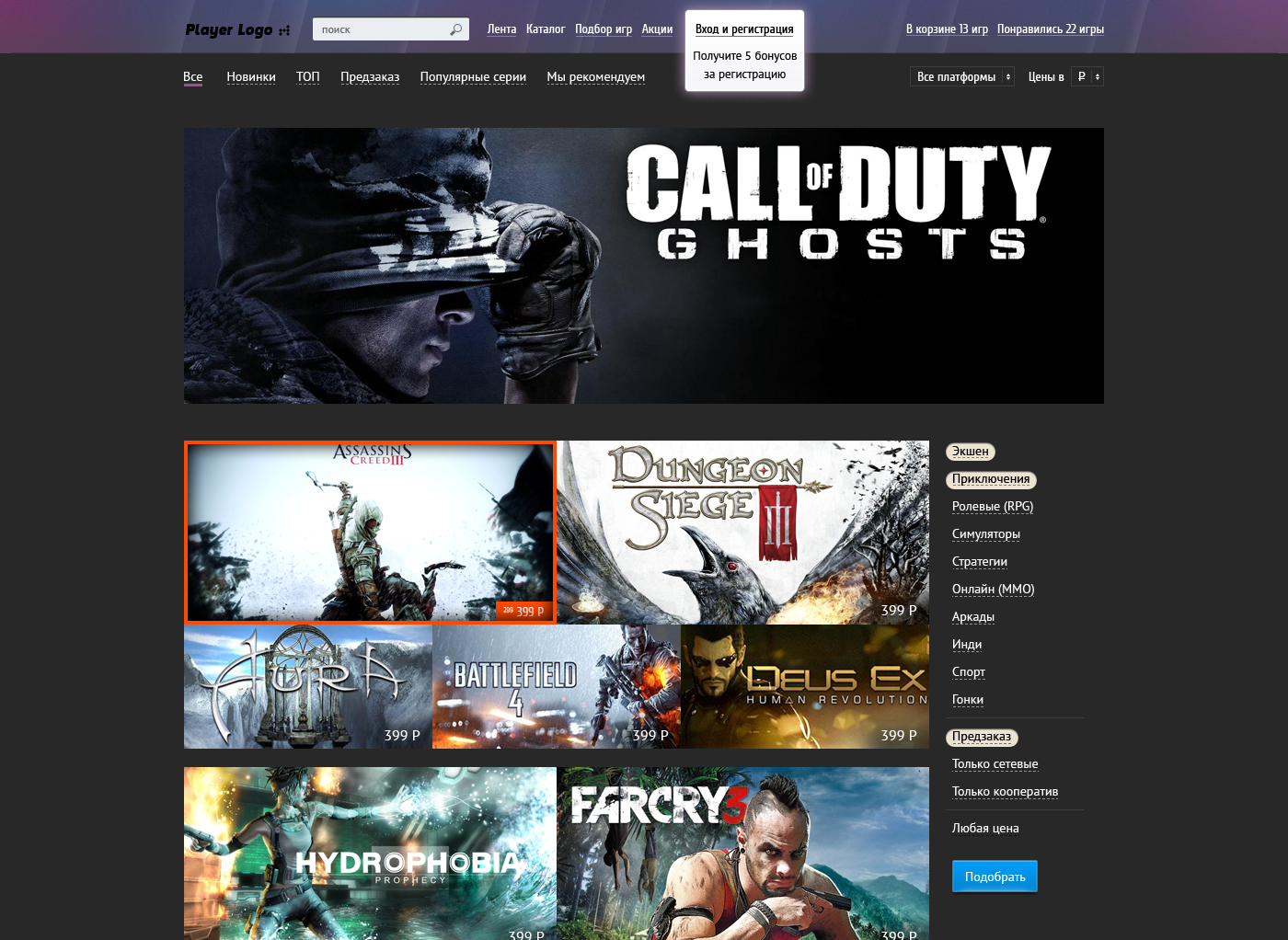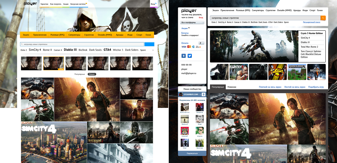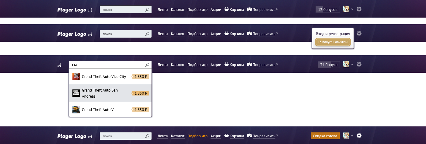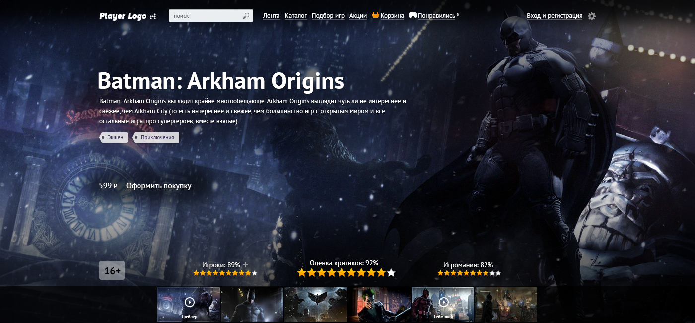 А потім зʼявилась ідея з промо для кожної гри і перший прототип сторінки гри виглядав так. Далі вже цей екран став початковою точкою для усього іншого сайту.